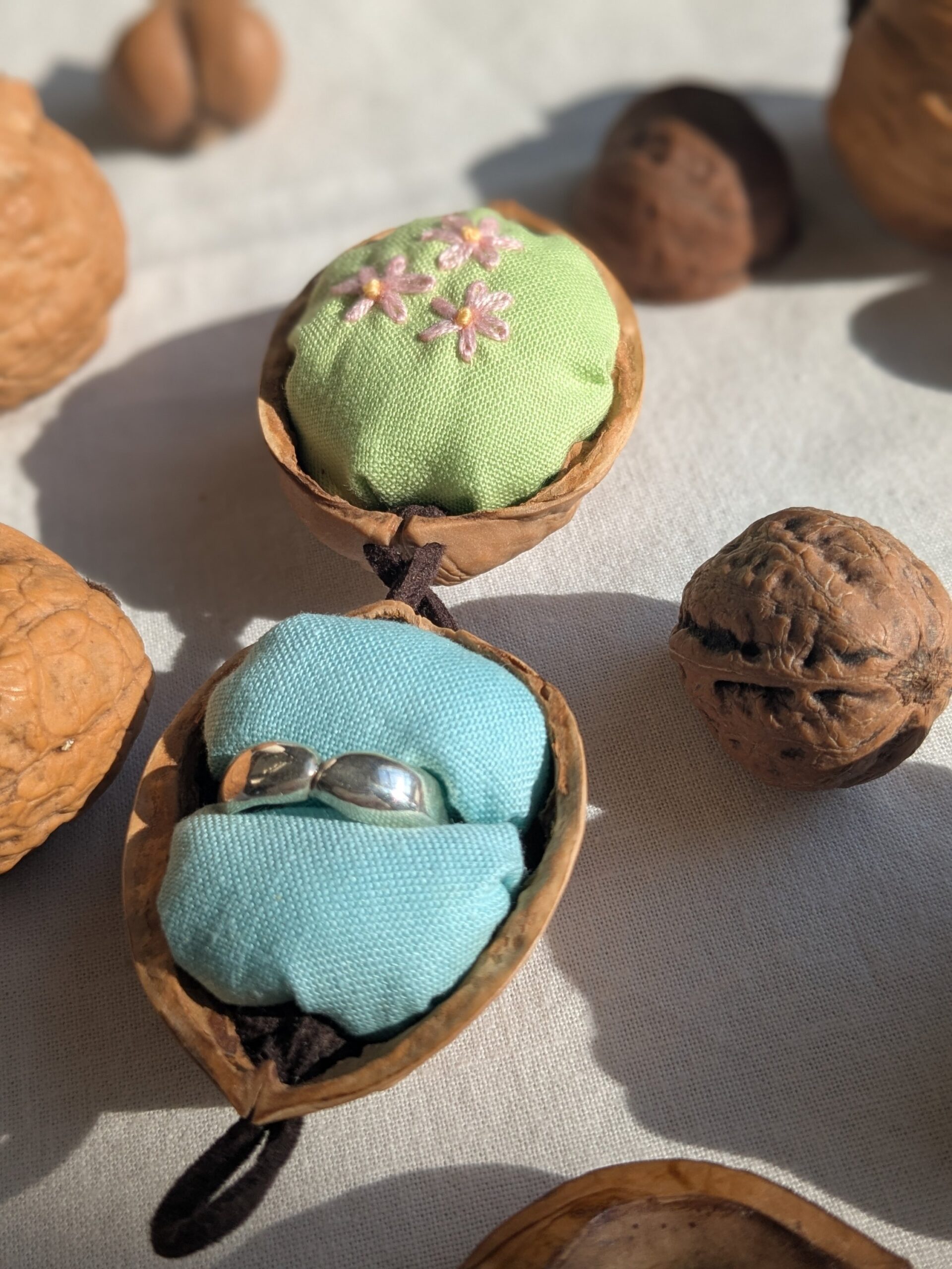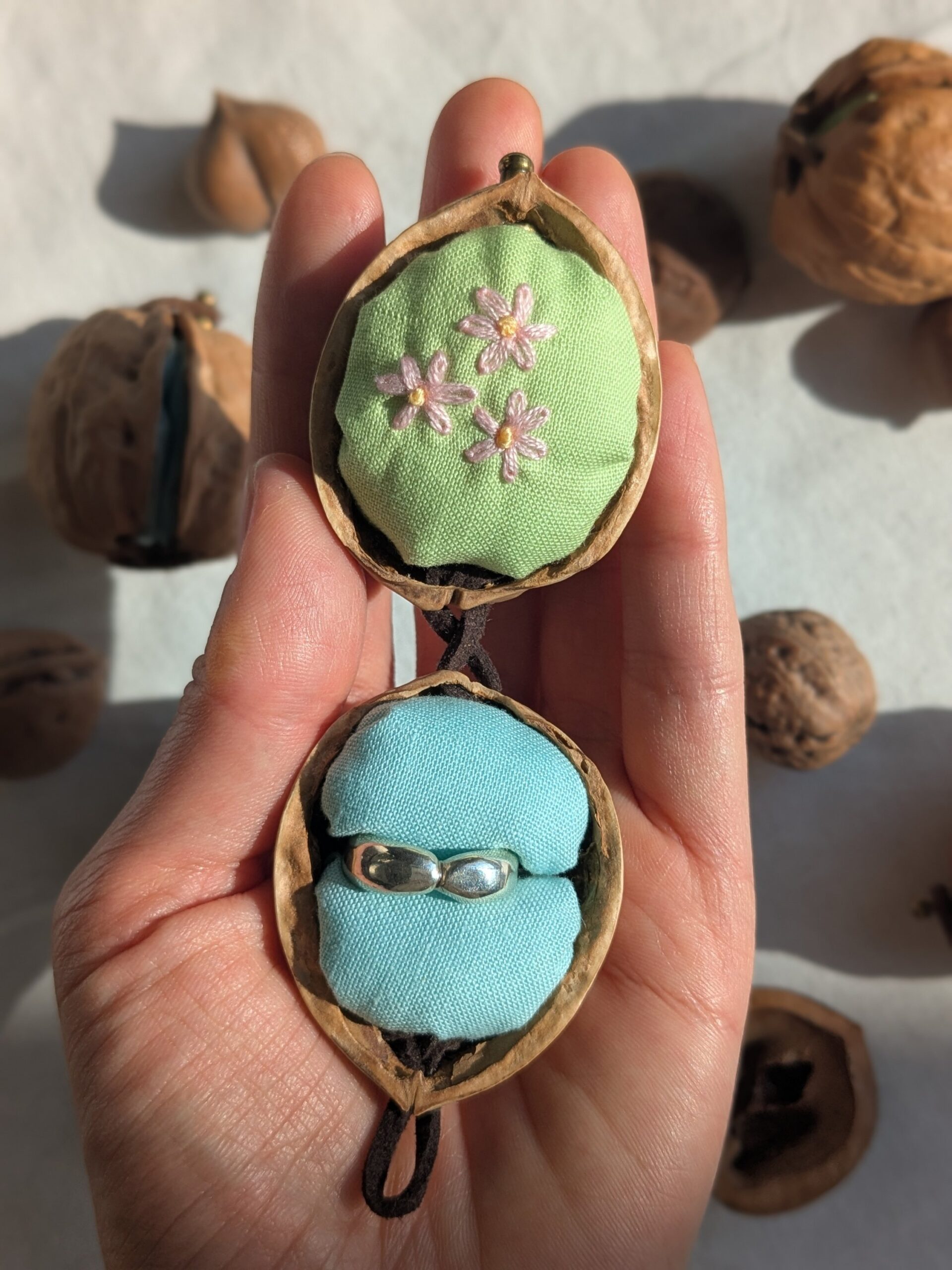 中の布クッションは、接着剤を使用せず、胡桃に固定をしていません。その為、出し入れの際にクッションがズレることがございます。