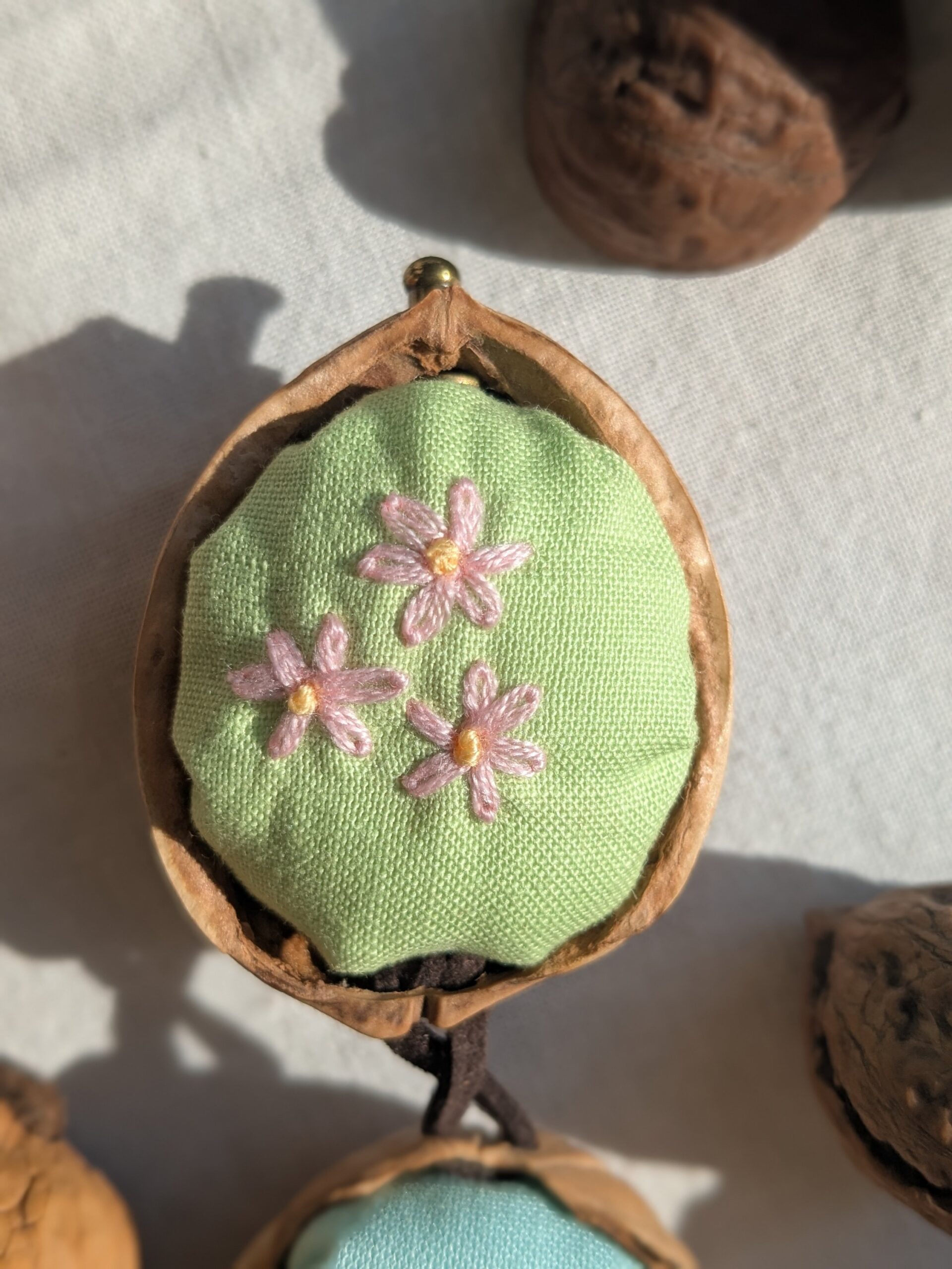 中の布地には春モチーフの花が3つ手縫いで刺繍されています。