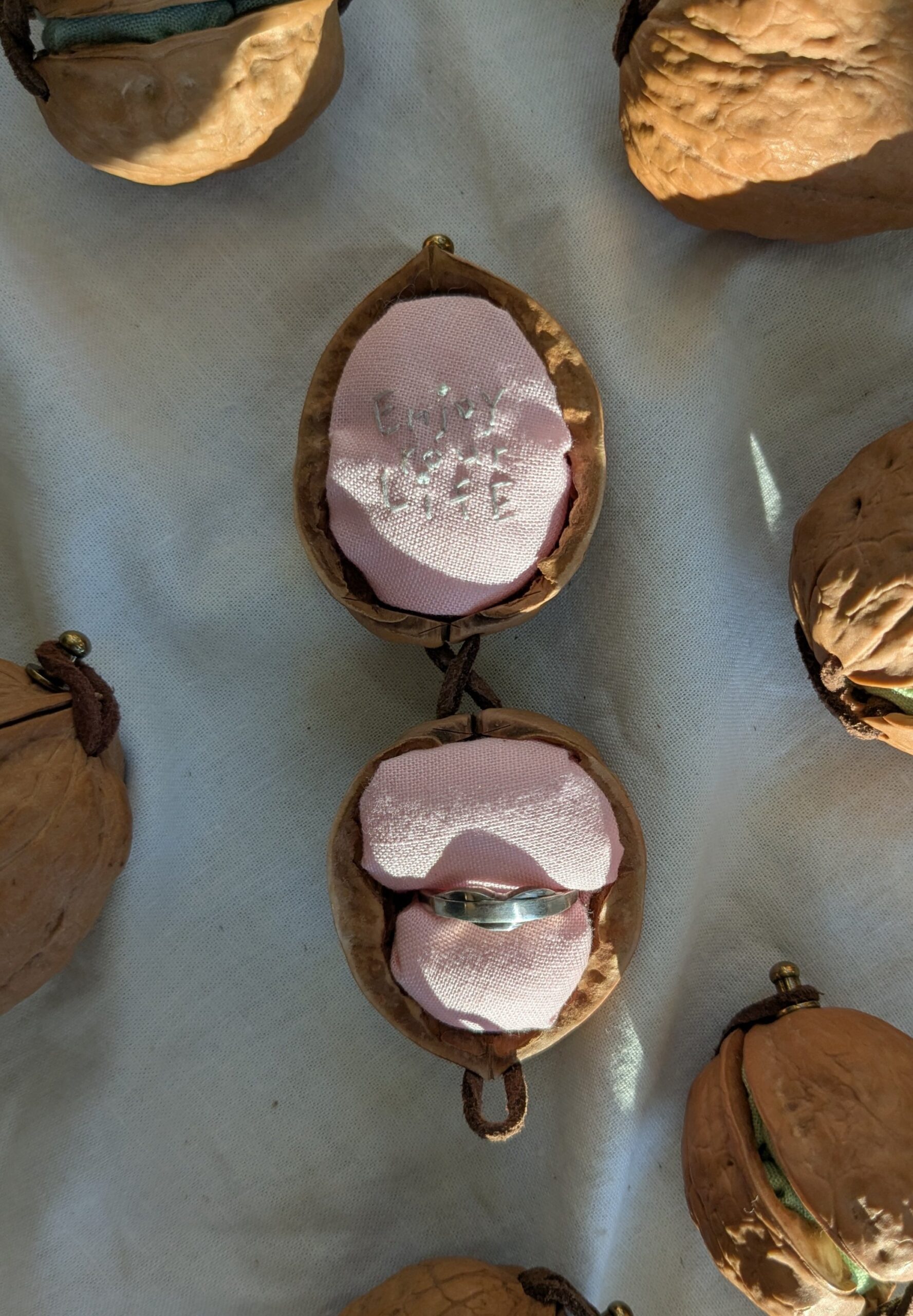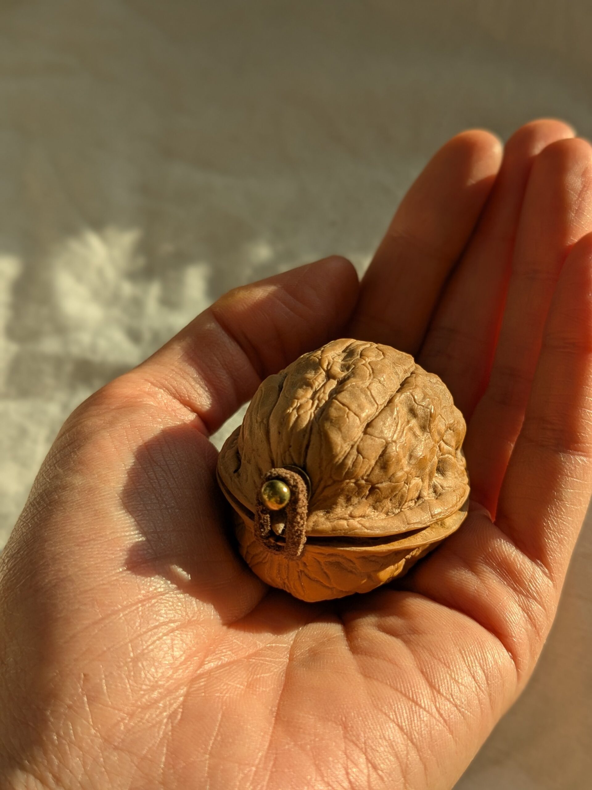中の布クッションは、接着剤を使用せず、胡桃に固定をしていません。その為、出し入れの際にクッションがズレることがございます。