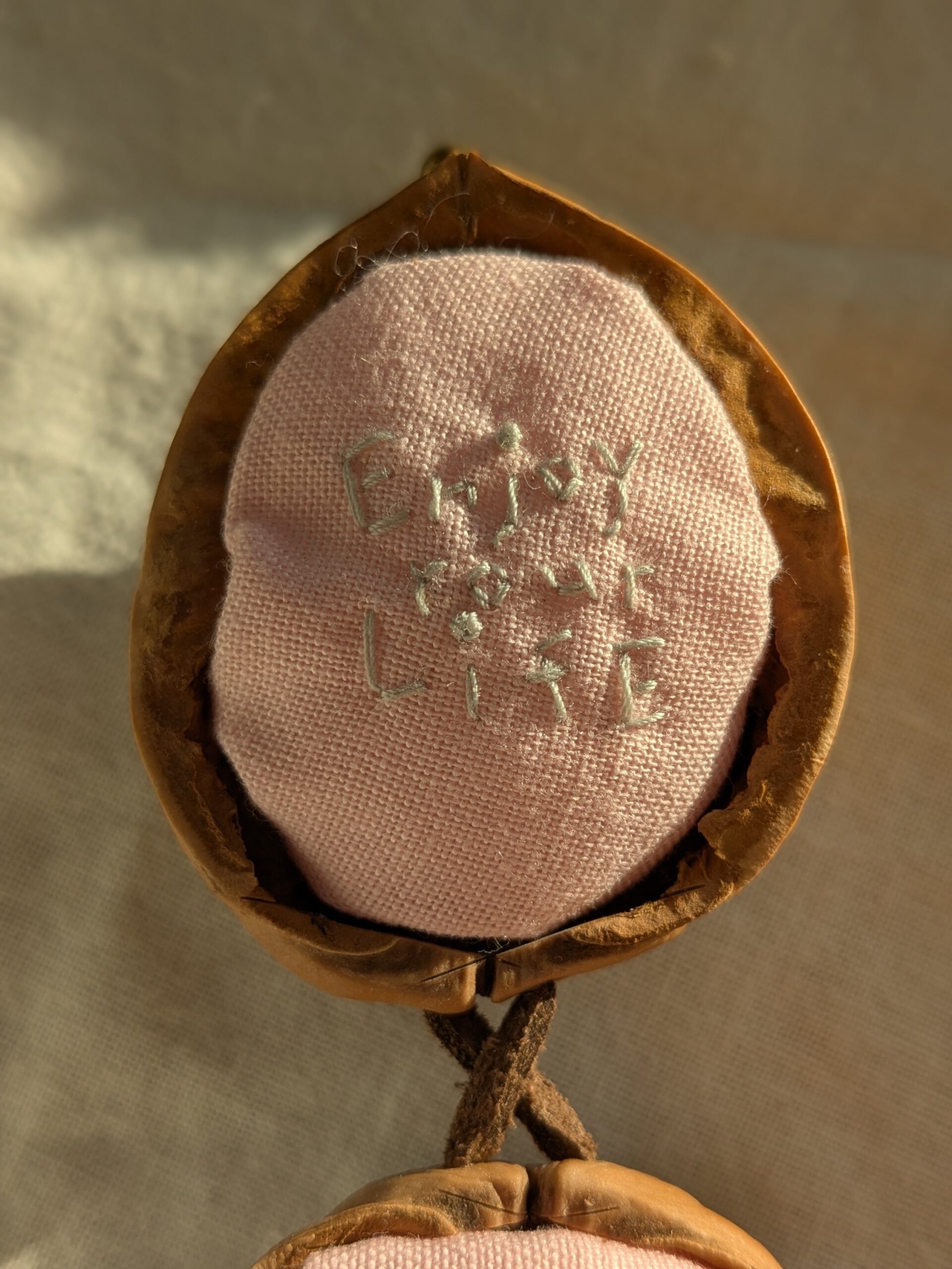 中の布地には Enjoy your Life と手縫いで刺繍がされています。