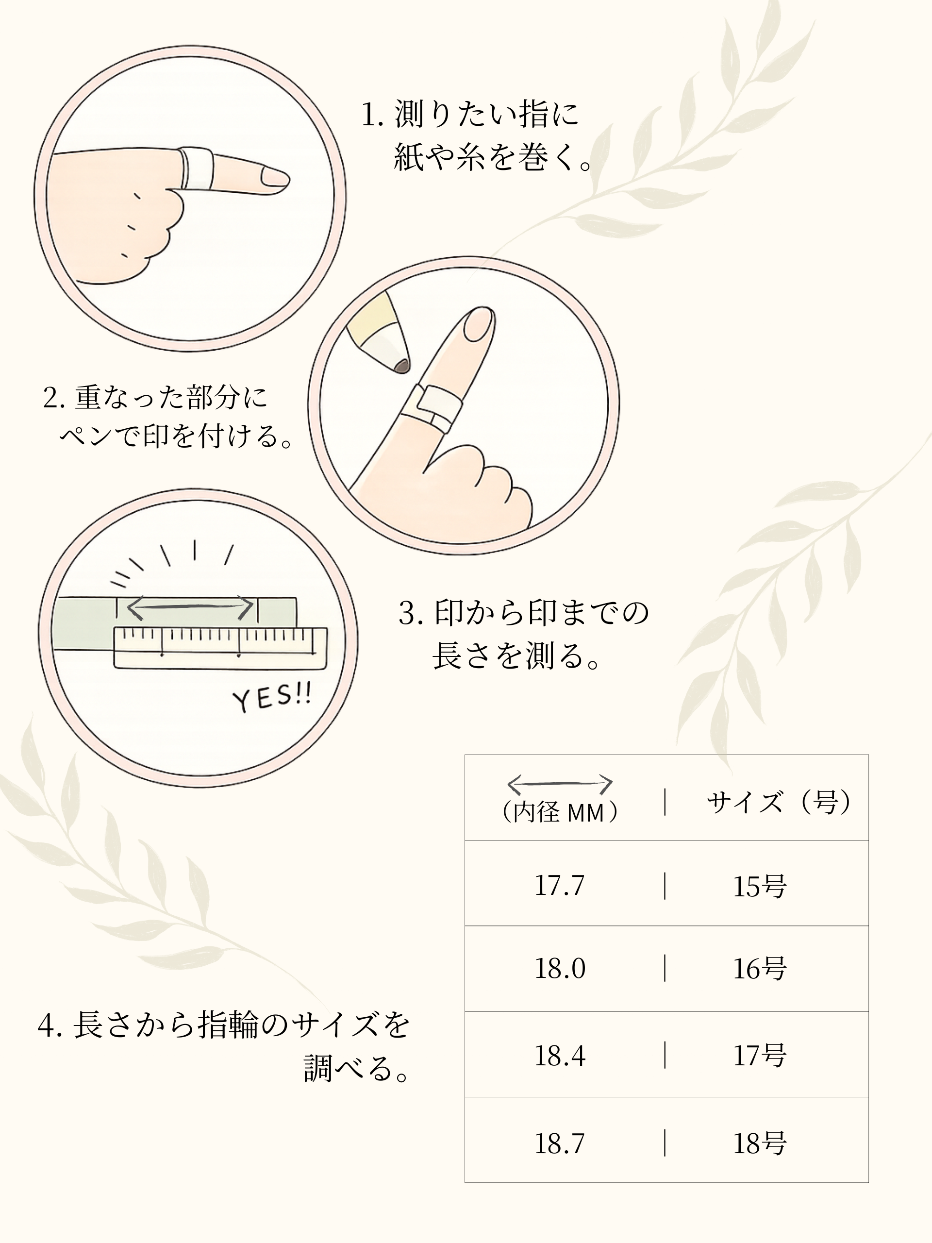 指輪のサイズ表と、測り方は商品画像の最後で紹介しています。