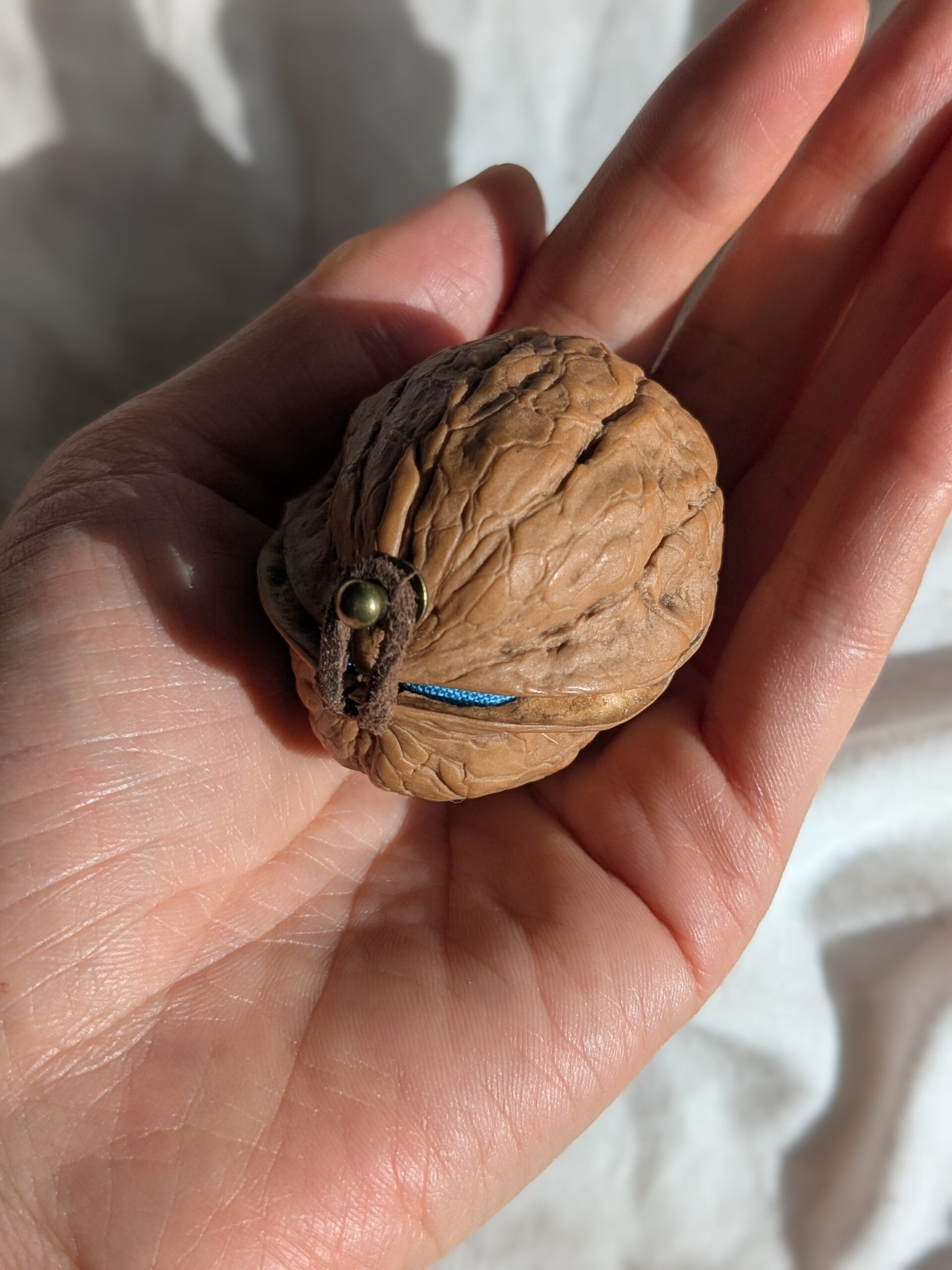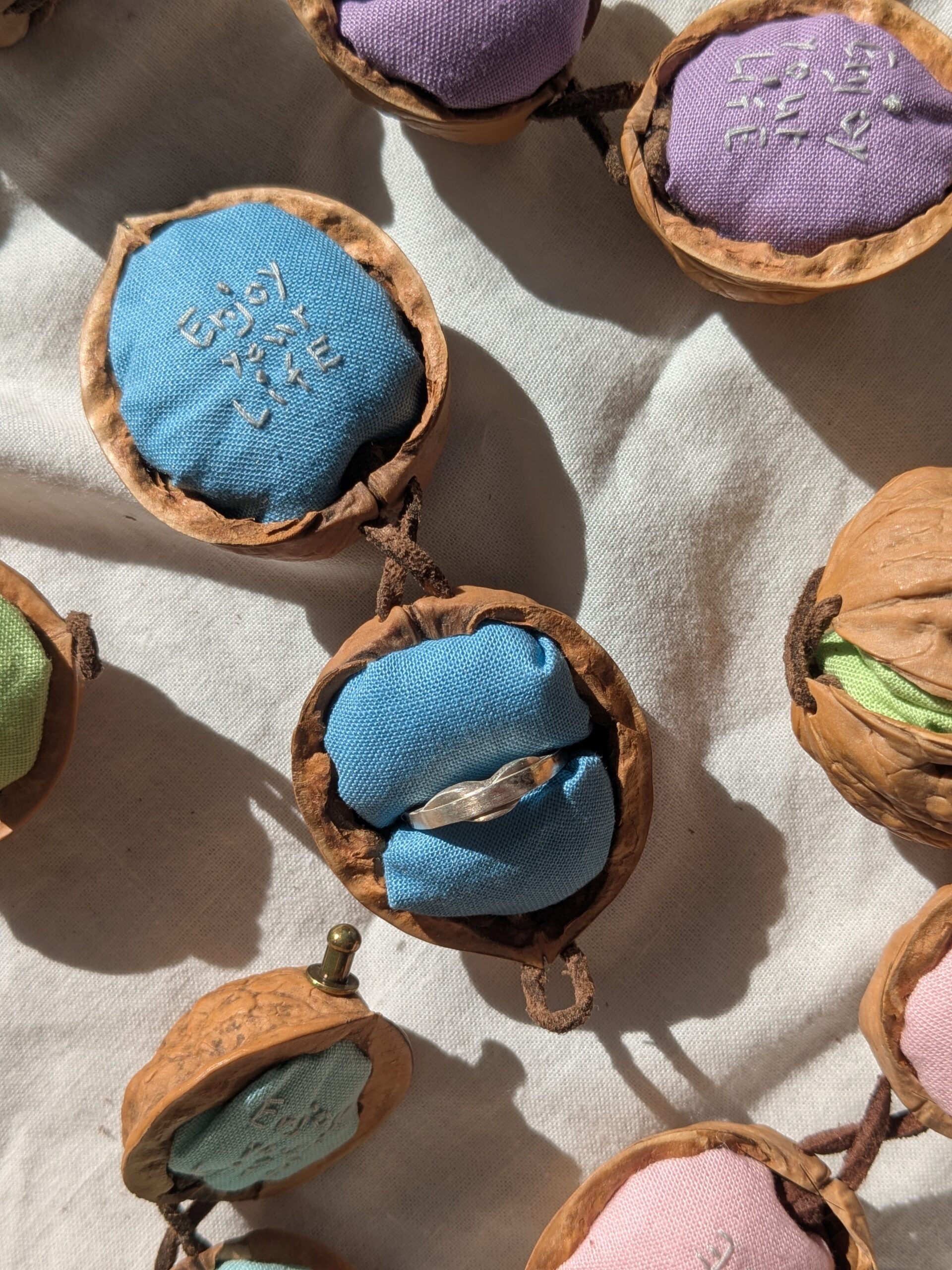 本物の胡桃に穴を開けてスウェード紐を通し、指輪ケースとしました。
